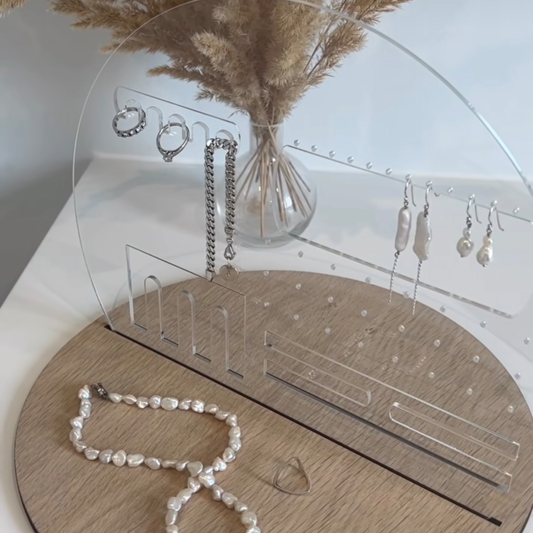 Vores smykkeholder i smukt egetræ og stilfuldt akryl, er den ideelle måde at organisere...