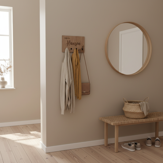 Gør entréen både personlig og praktisk med denne knagerække i lyst træ med familienavnet...