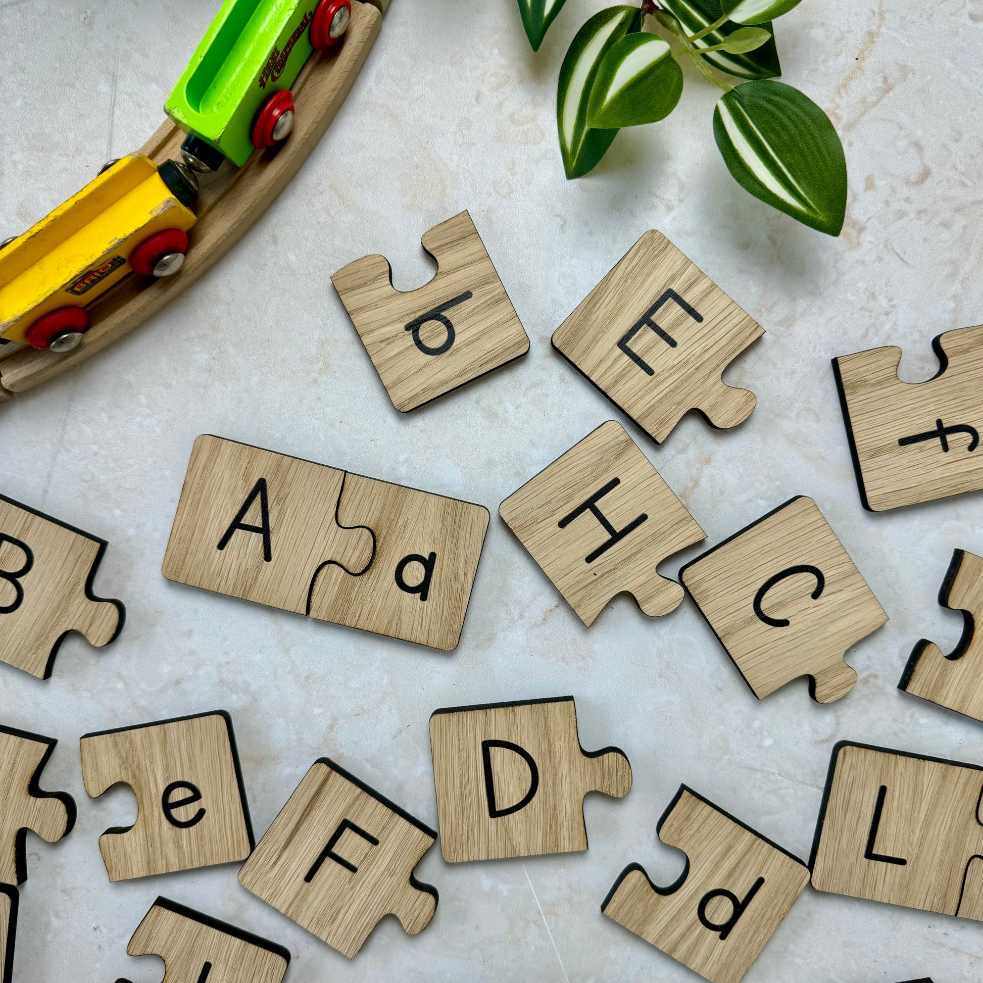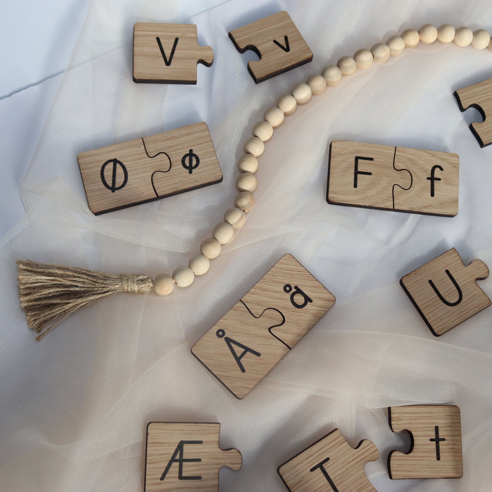 Store og Små Bogstaver: Hver brik i puslespillet har et stort bogstav på den ene side og det tilsvarende lille bogstav på den anden side. Dette design hjælper børn med at forstå og forbinde de to former af samme bogstav, hvilket styrker deres alfabetforståelse.