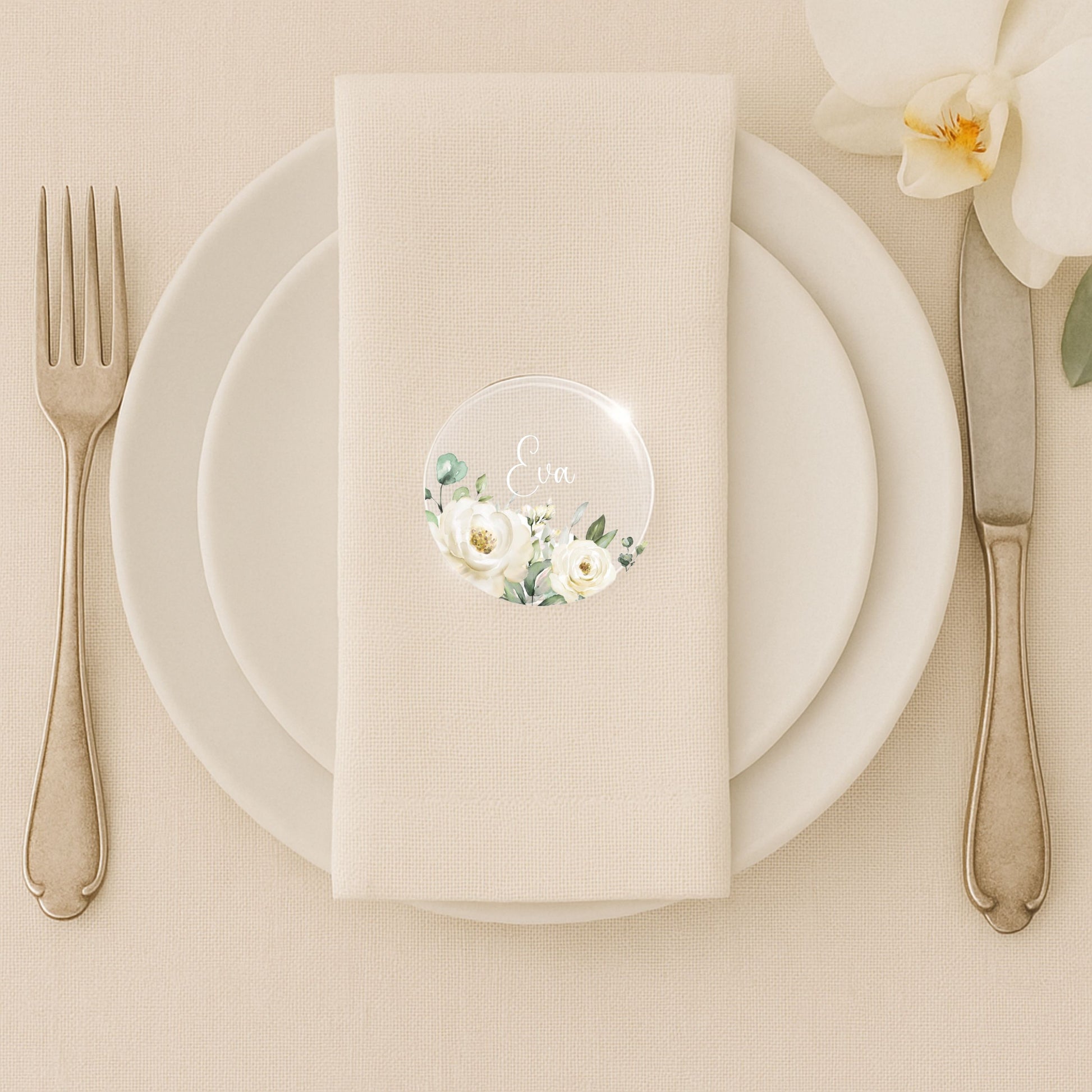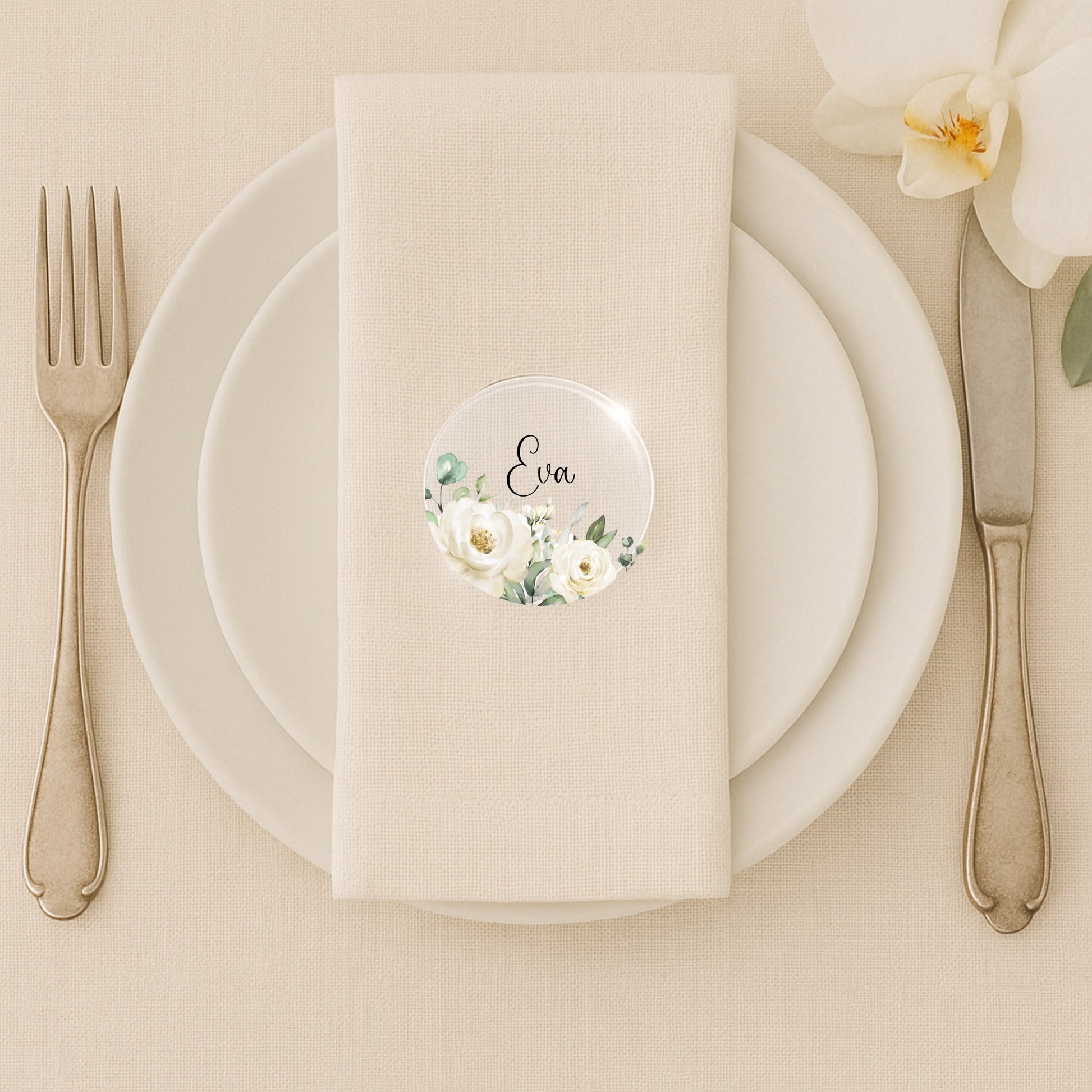 Gør din næste begivenhed eller middagsselskab uforglemmelig med vores smukt designede runde bordkort i akryl med eucalyptusblade. Disse elegante bordkort tilføjer en naturlig og fortryllende touch til din borddækning og er det perfekte valg for dem, der ønsker at skabe en indbydende atmosfære med et strejf af elegance.
