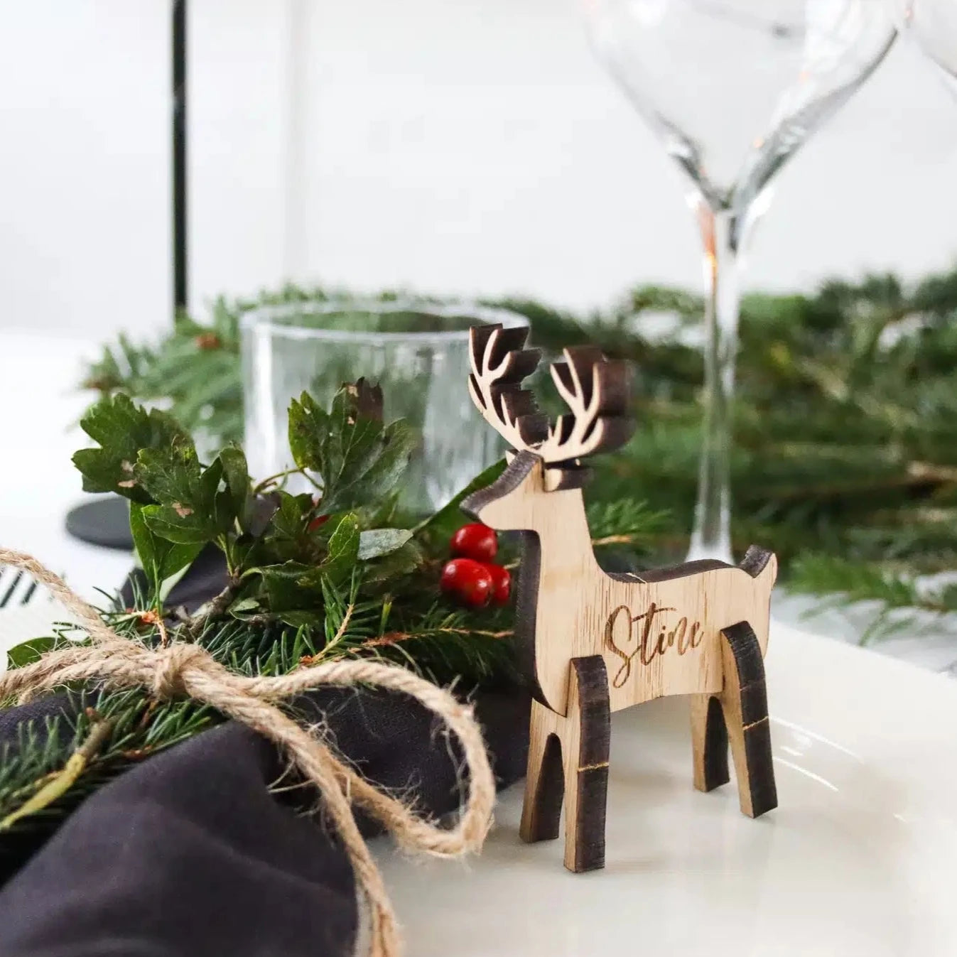 Vores Stående Rensdyr Bordkort er skabt med omhu og opmærksomhed på detaljer. Hvert bordkort er skåret med præcision fra et højkvalitets materiale, der er både holdbart og stilfuldt. Bordkortet er formet som et charmerende rensdyr, der står stolt på bordet og venter på at byde dine gæster velkommen.