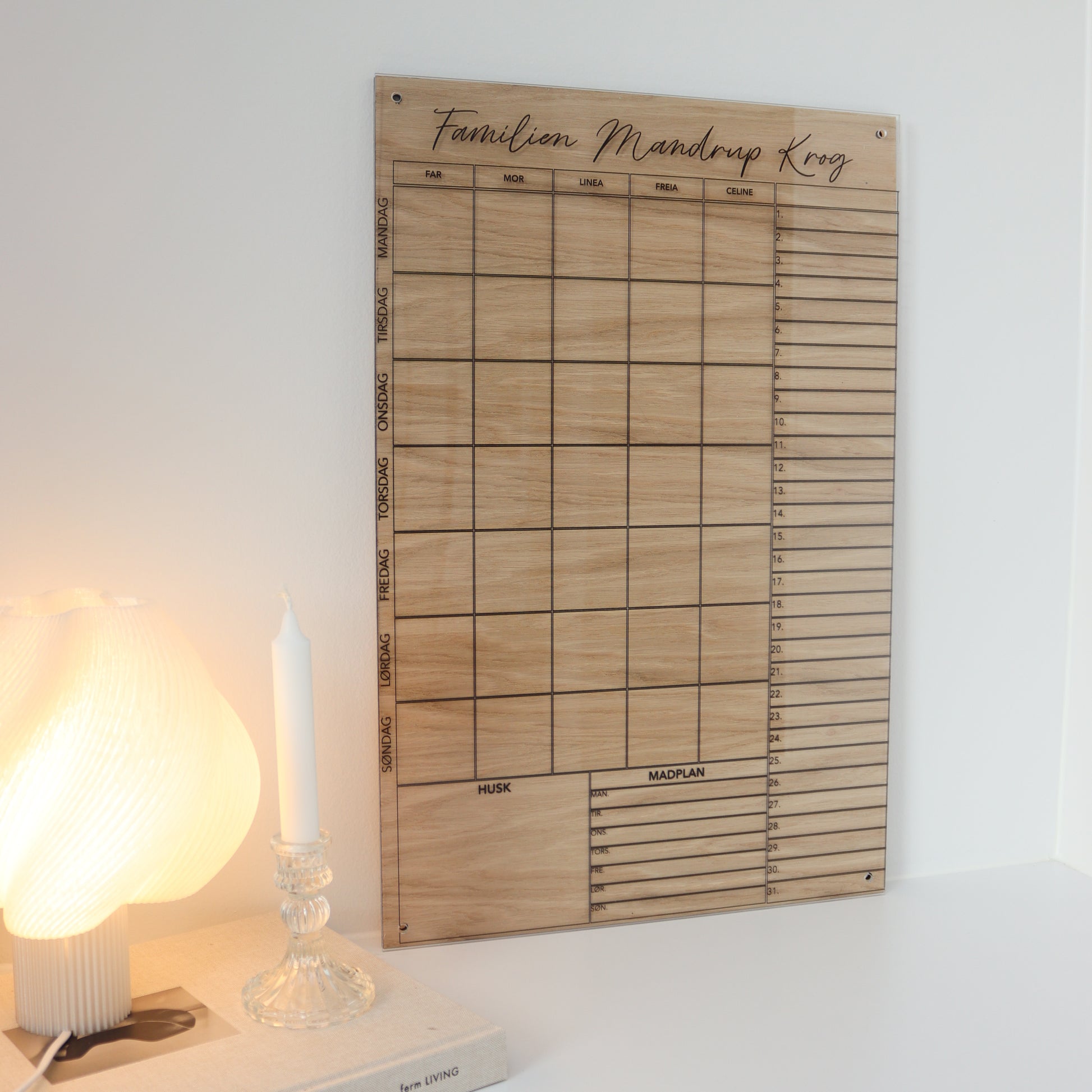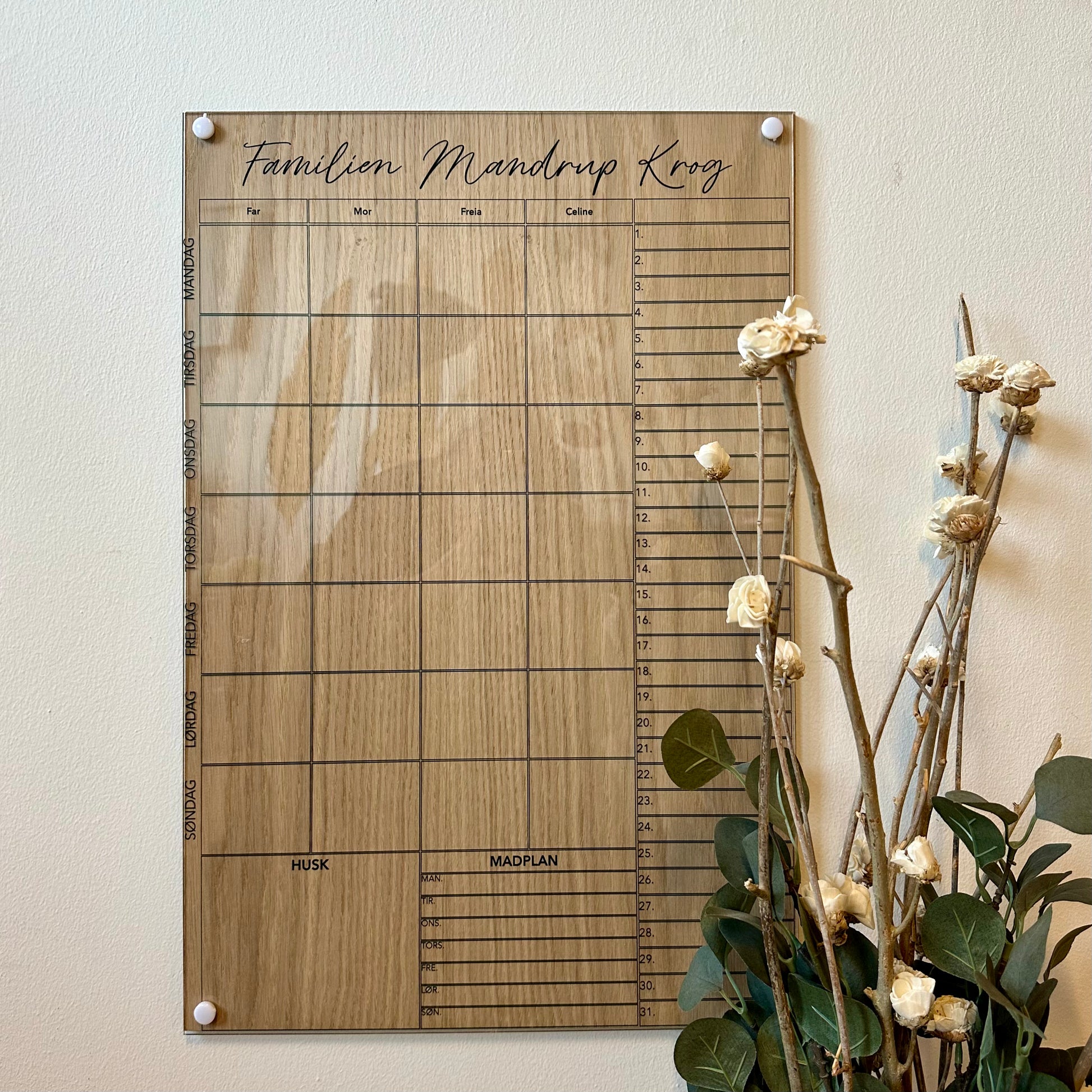 Introducerer vores Egetræs Familiekalender – en elegant og praktisk måde at organisere din families hektiske liv på. Denne fine kalender kombinerer funktionalitet og æstetik, da den er printet på en gennemsigtig akrylplade så den bevarer sine rene linjer, og har en forbløffende bagside af egetræs finér, som giver et smukt udseende.