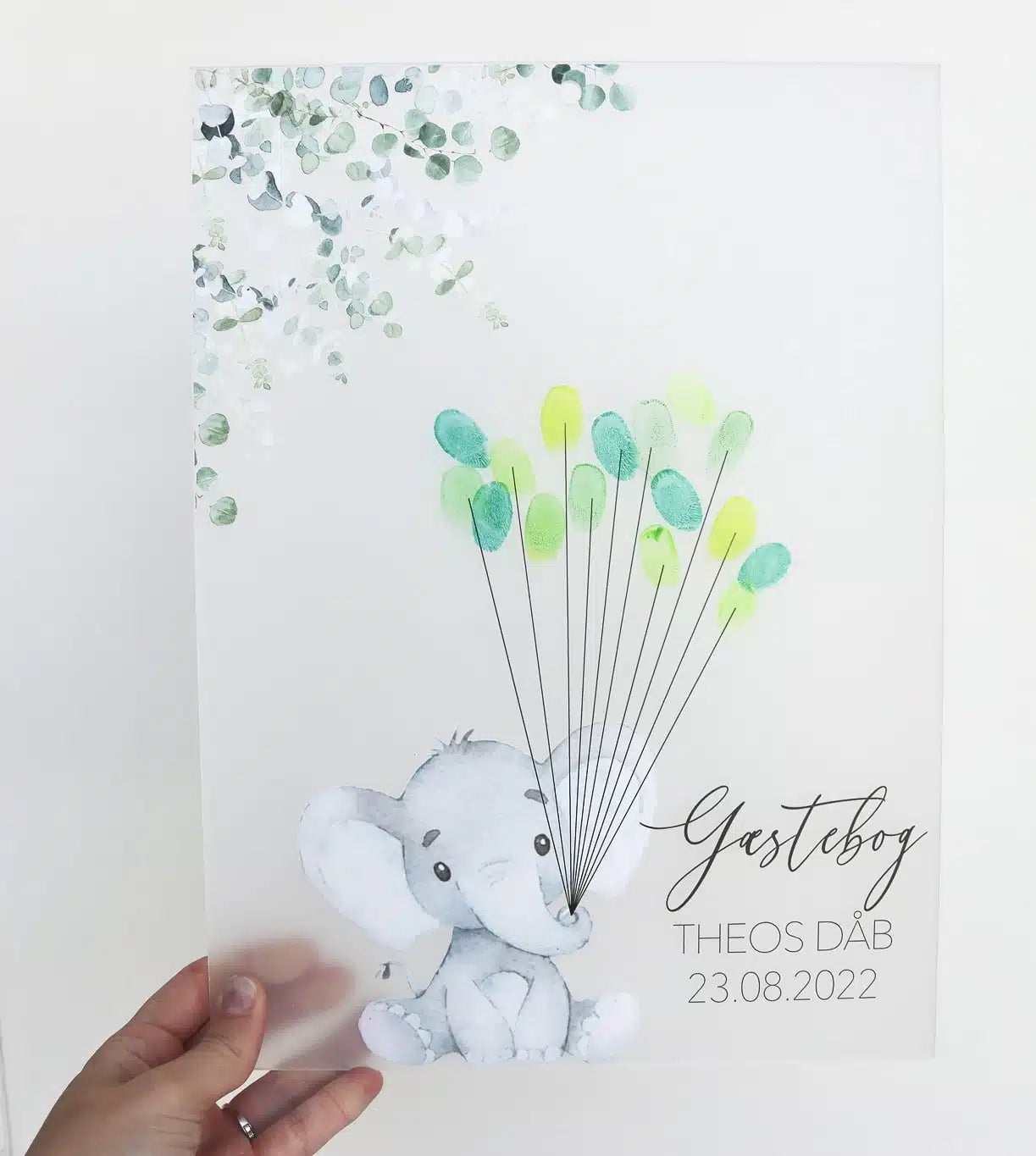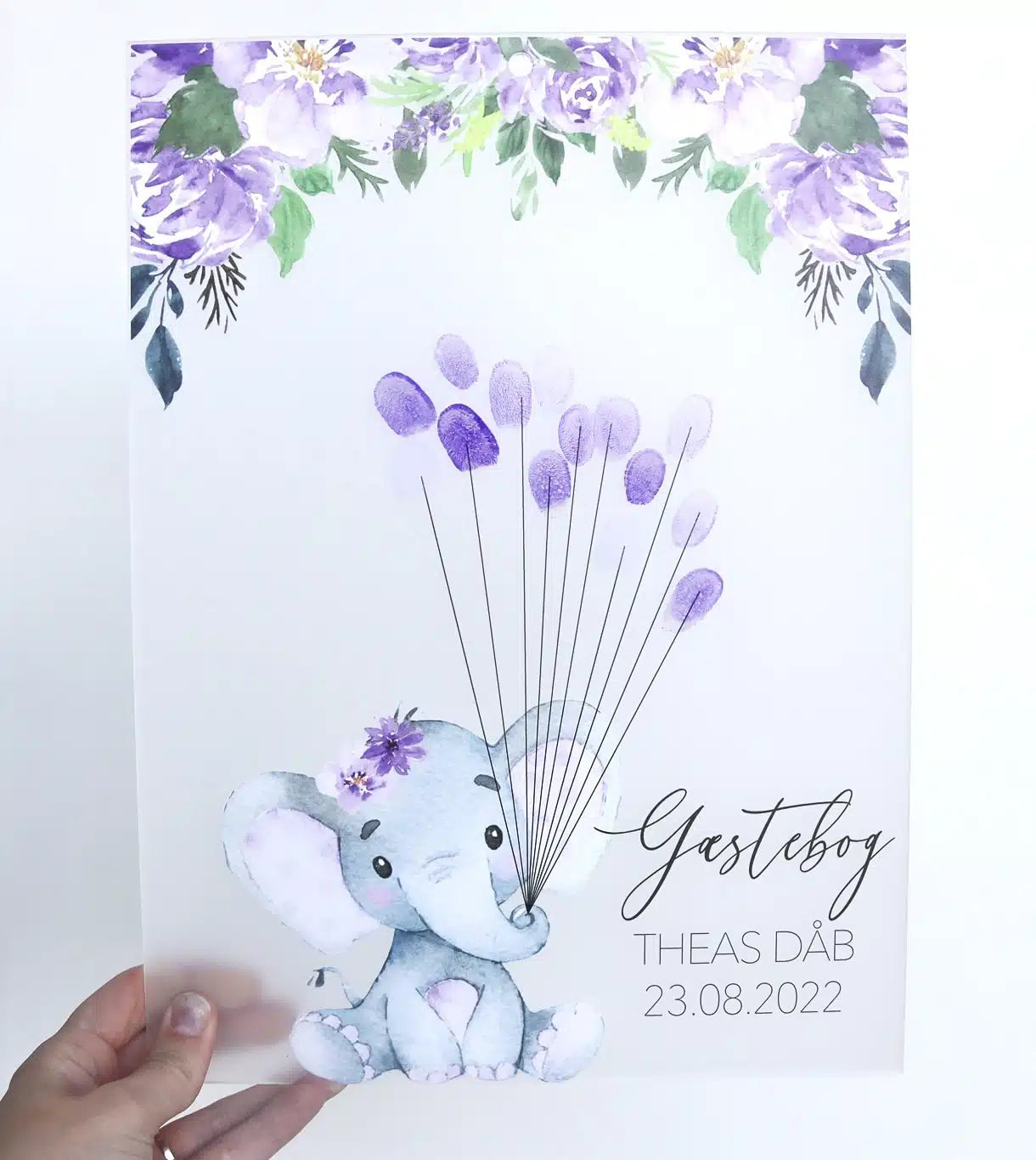 Ønsker du et personligt minde fra den store dag, så danner denne søde elefant rammerne for jeres gæster med en personlig hilsen i form af deres fingeraftryk.