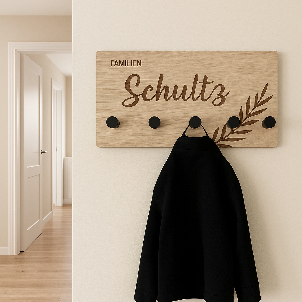 Gør entréen både personlig og praktisk med denne knagerække i lyst træ med familienavnet Schultz indgraveret i elegant skrift. De fire solide sorte knager giver plads til jakker, tasker og nøgler, mens det stilrene design passer perfekt til nordisk indretning.
