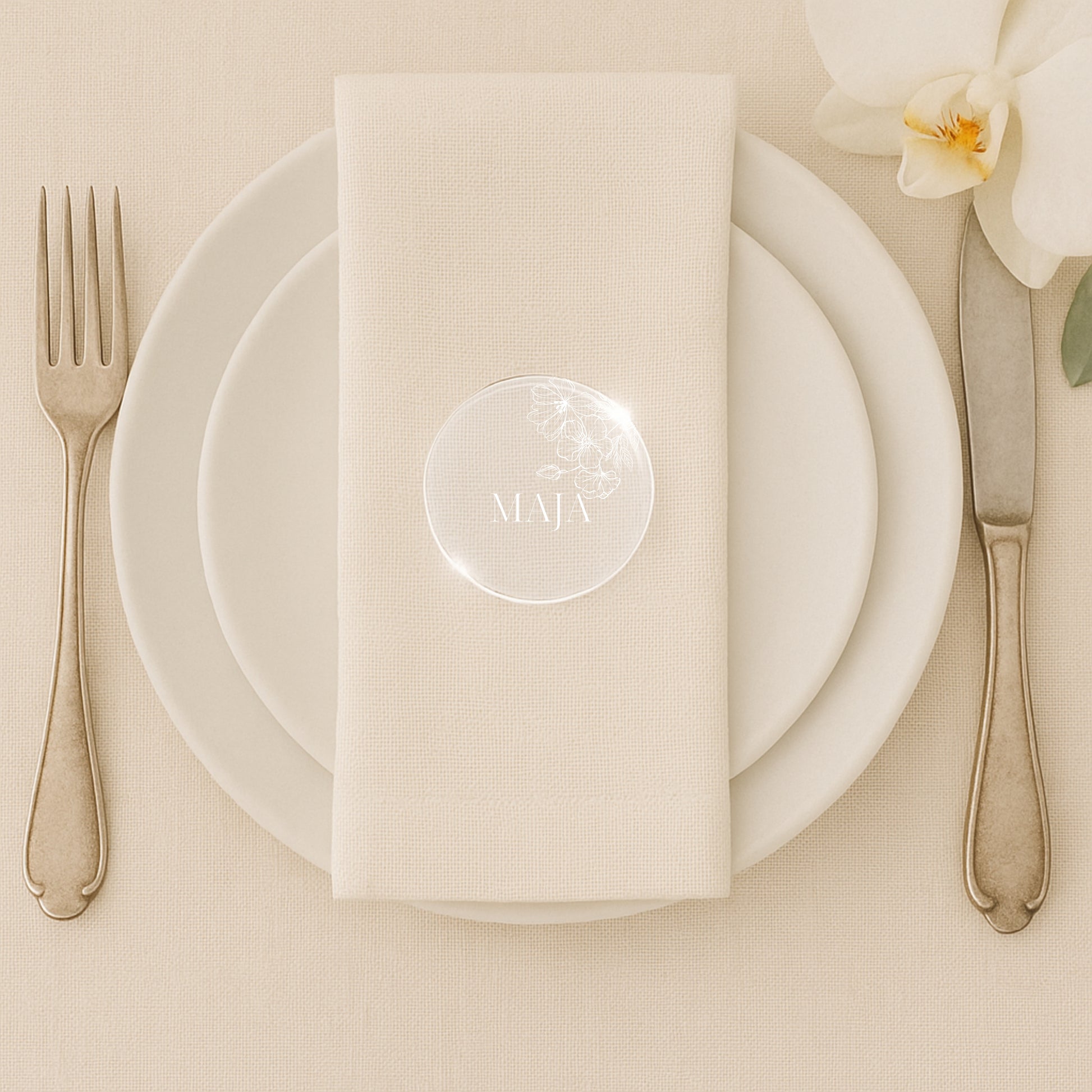 Gør din næste begivenhed eller middagsselskab endnu mere mindeværdig med vores smukt designede bordkort i akryl med fine blomsterdetaljer. Disse elegante bordkort tilføjer en naturlig og fortryllende touch til din borddækning og er det perfekte valg for dem, der ønsker at skabe en indbydende atmosfære med et strejf af elegance.