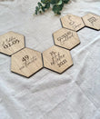 De fås i en pakke af 6 stk. og bliver udskåret i egetræ, og kan fås med graveret eller printet tekst.
