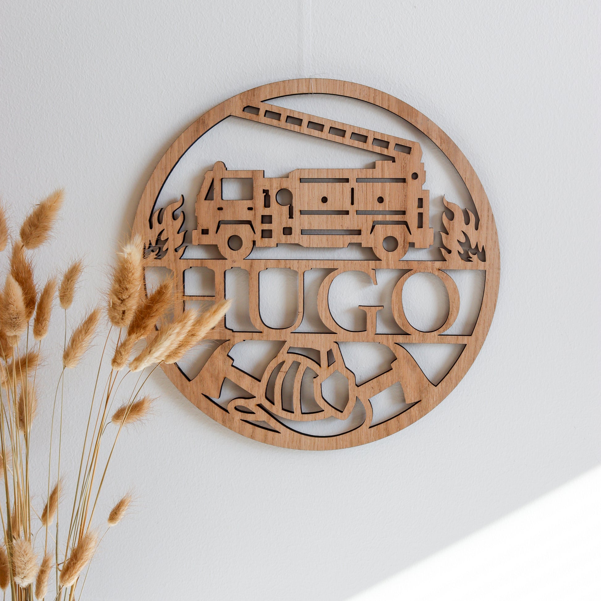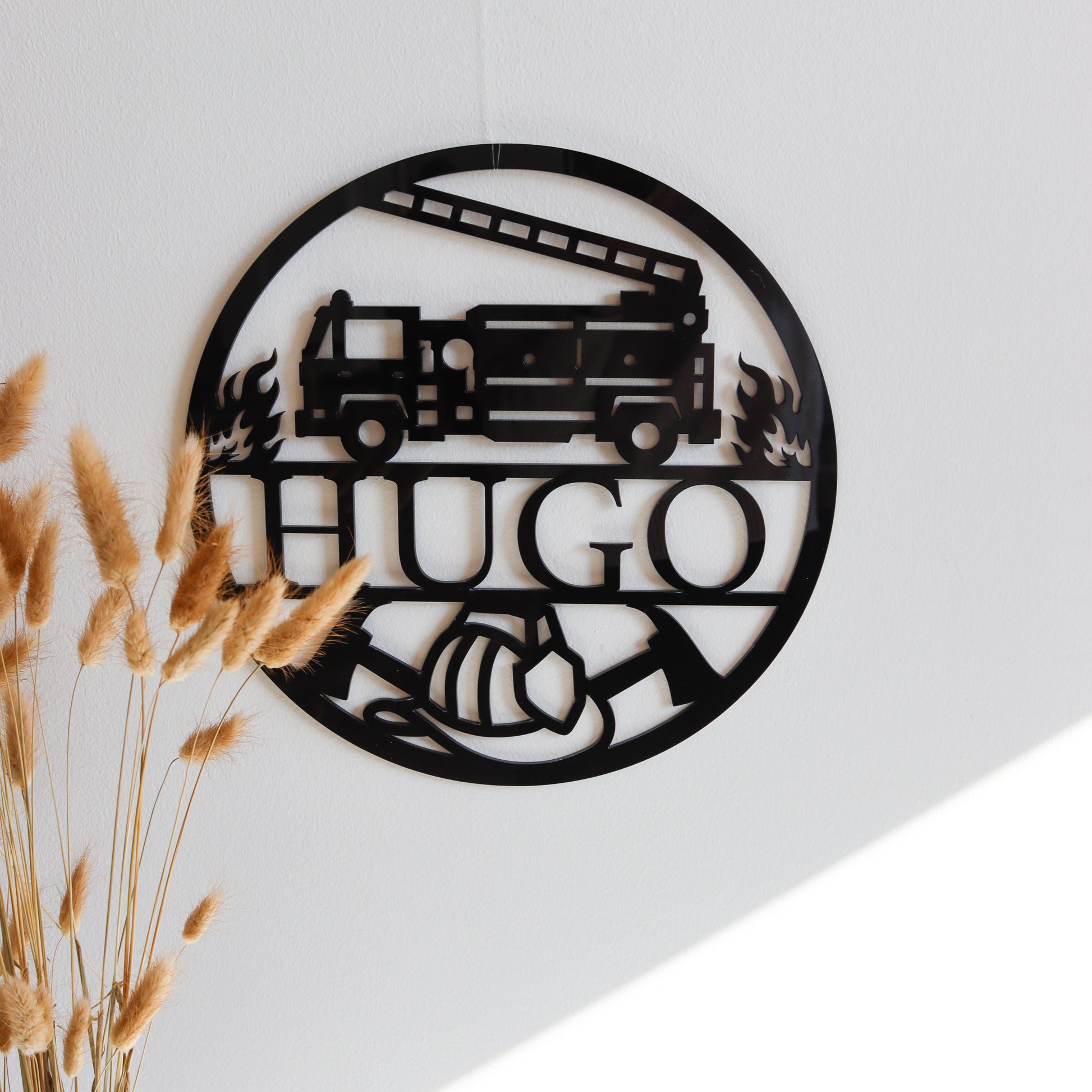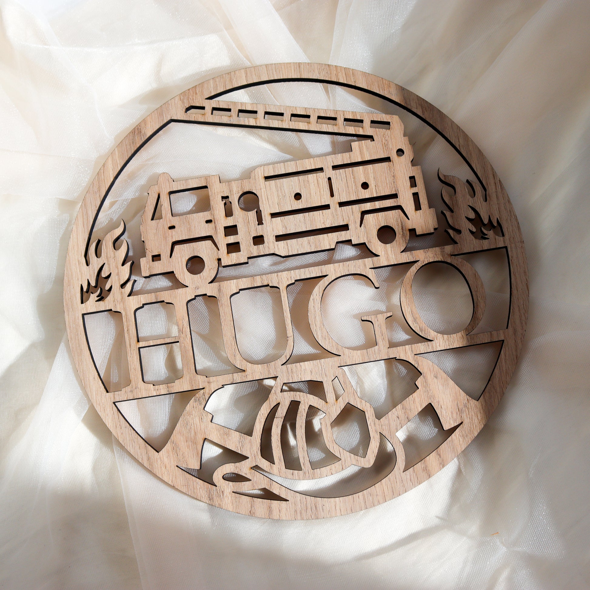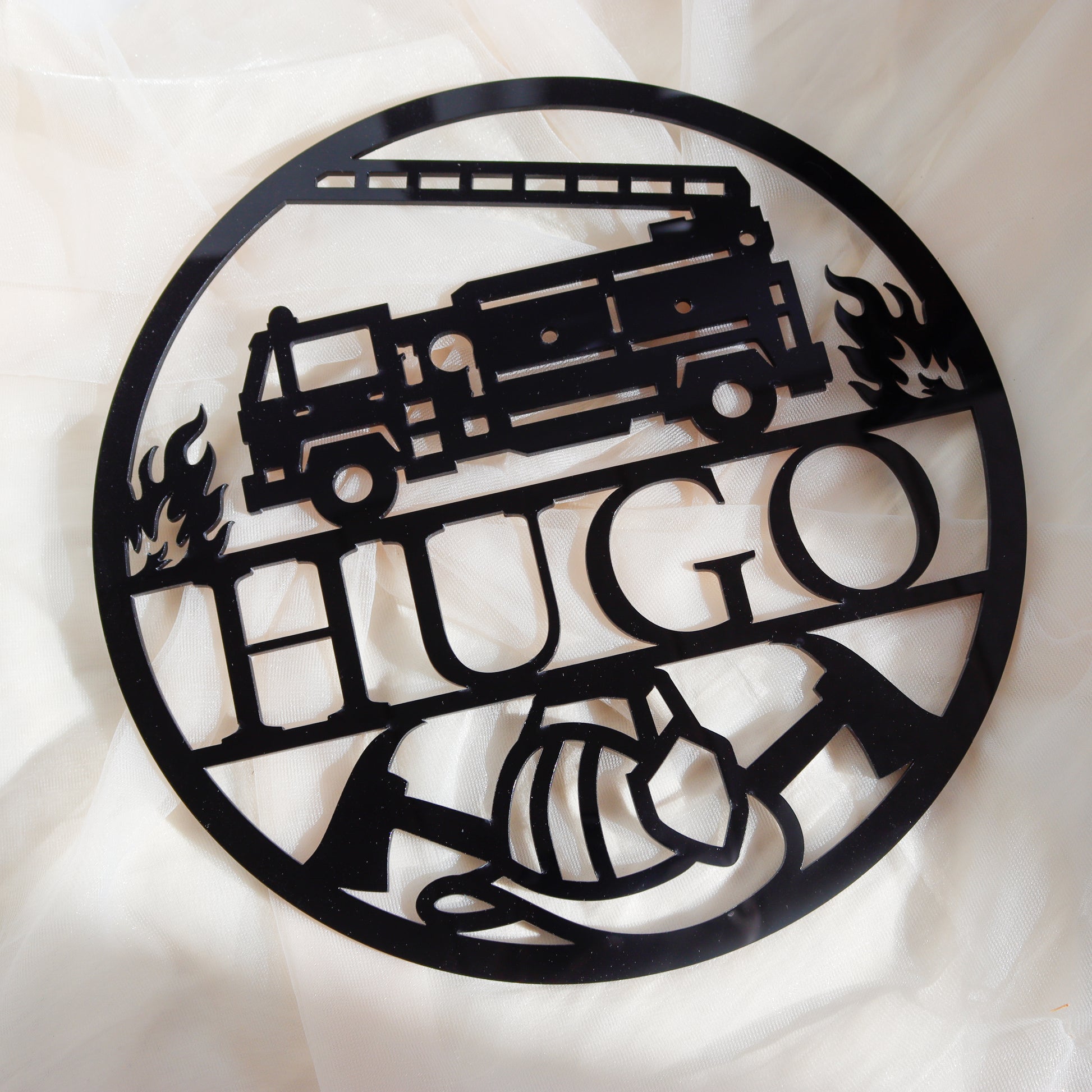 Giv børneværelset et unikt og personligt præg med vores flotte runde navneskilt med en detaljeret brandbil. Skiltet kan personliggøres med barnets navn og fås i enten eksklusivt egetræ eller stilrent sort akryl – begge materialer af høj kvalitet.