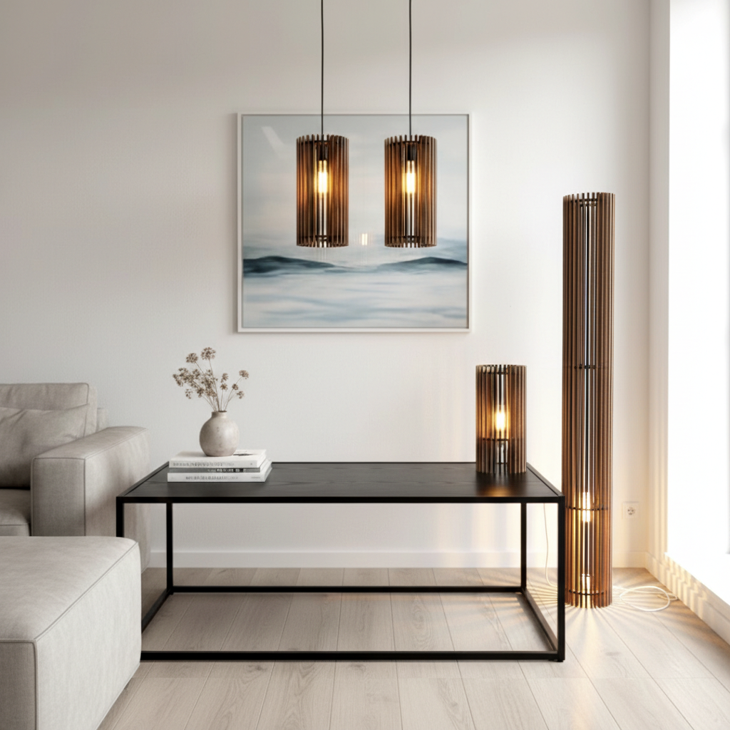 Alle lamperne har den samme ikoniske lampeskærm i vertikale egetræslister, som smukt omkranser lyskilden og skaber et levende spil af lys og skygger i rummet. Designet emmer af nordisk ro og varme – og giver et harmonisk udtryk, når flere bruges sammen.