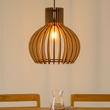 Denne moderne loftlampe i træ kombinerer skandinavisk minimalisme med naturlig varme. Lampens unikke design med buede lameller fremhæver den smukke pære og skaber et behageligt, blødt lys over spisebordet. Perfekt som blikfang i spisestuen, stuen eller køkkenet, hvor den tilføjer både hygge og stil.