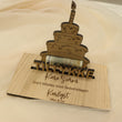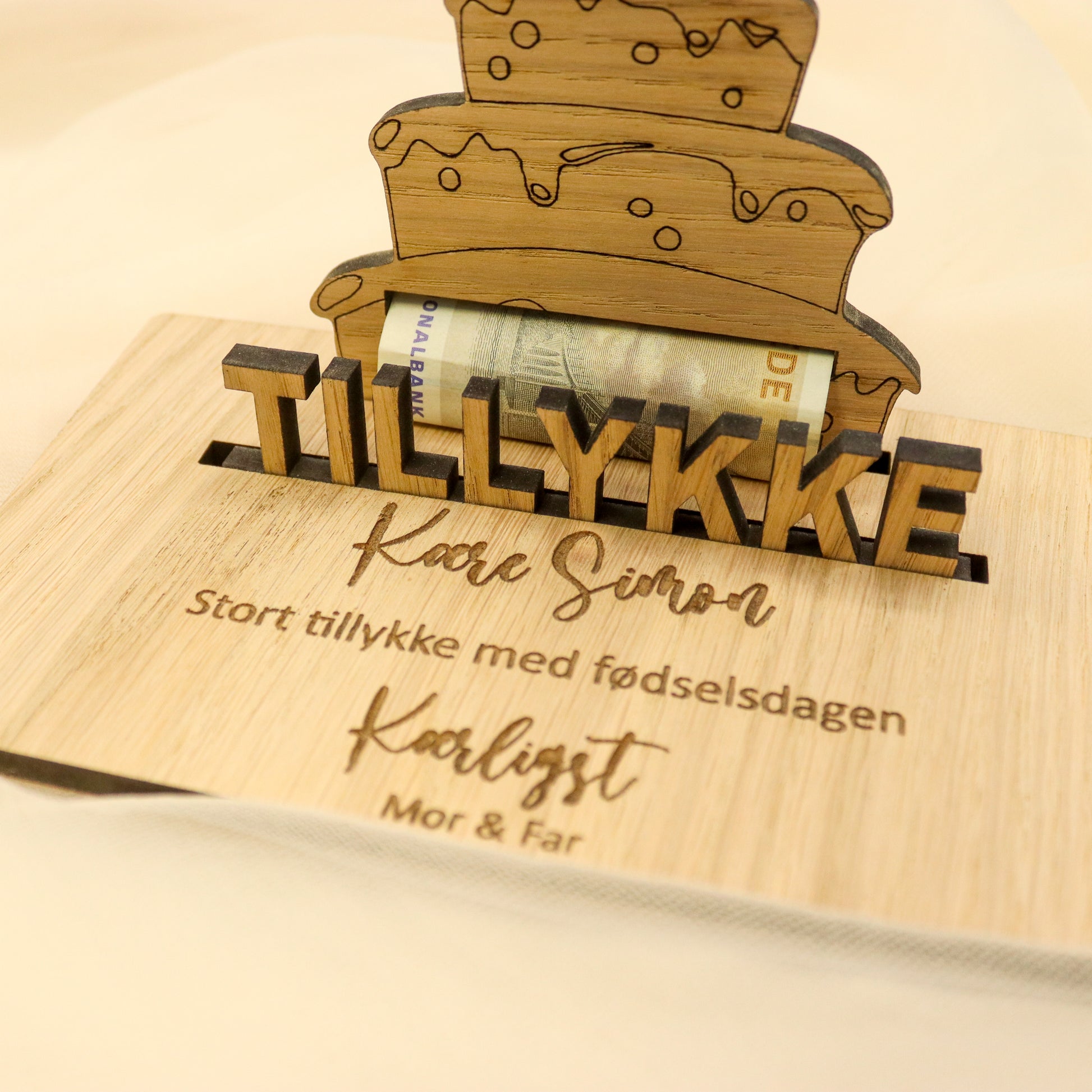 Fejr fødselsdagen med stil! Denne personlige træfigur formet som en fødselsdagslagkage med lys og “TILLYKKE”-tekst er ikke bare en sjov overraskelse – den har også en indbygget pengeseddelholder, så du kan give penge på en kreativ og festlig måde.