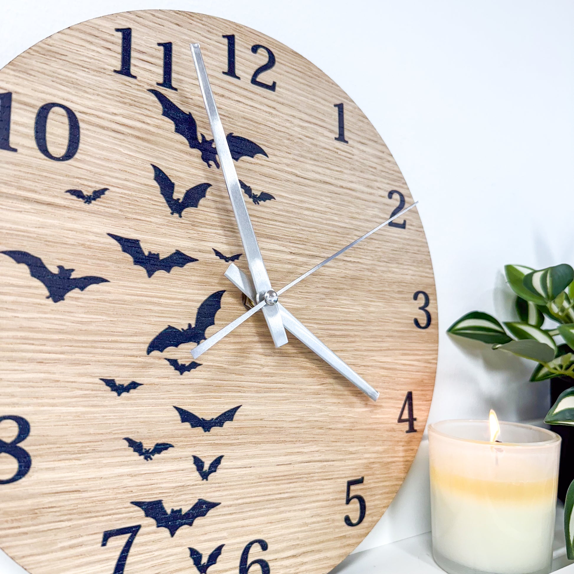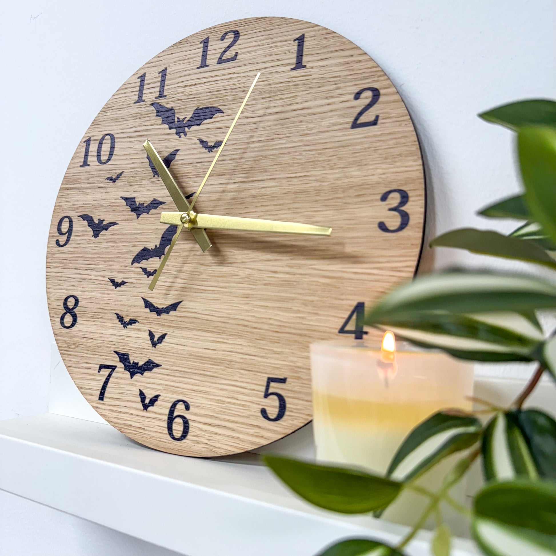 Uret er lavet af smukt egetræ og prydet med et flot flagermus print.