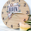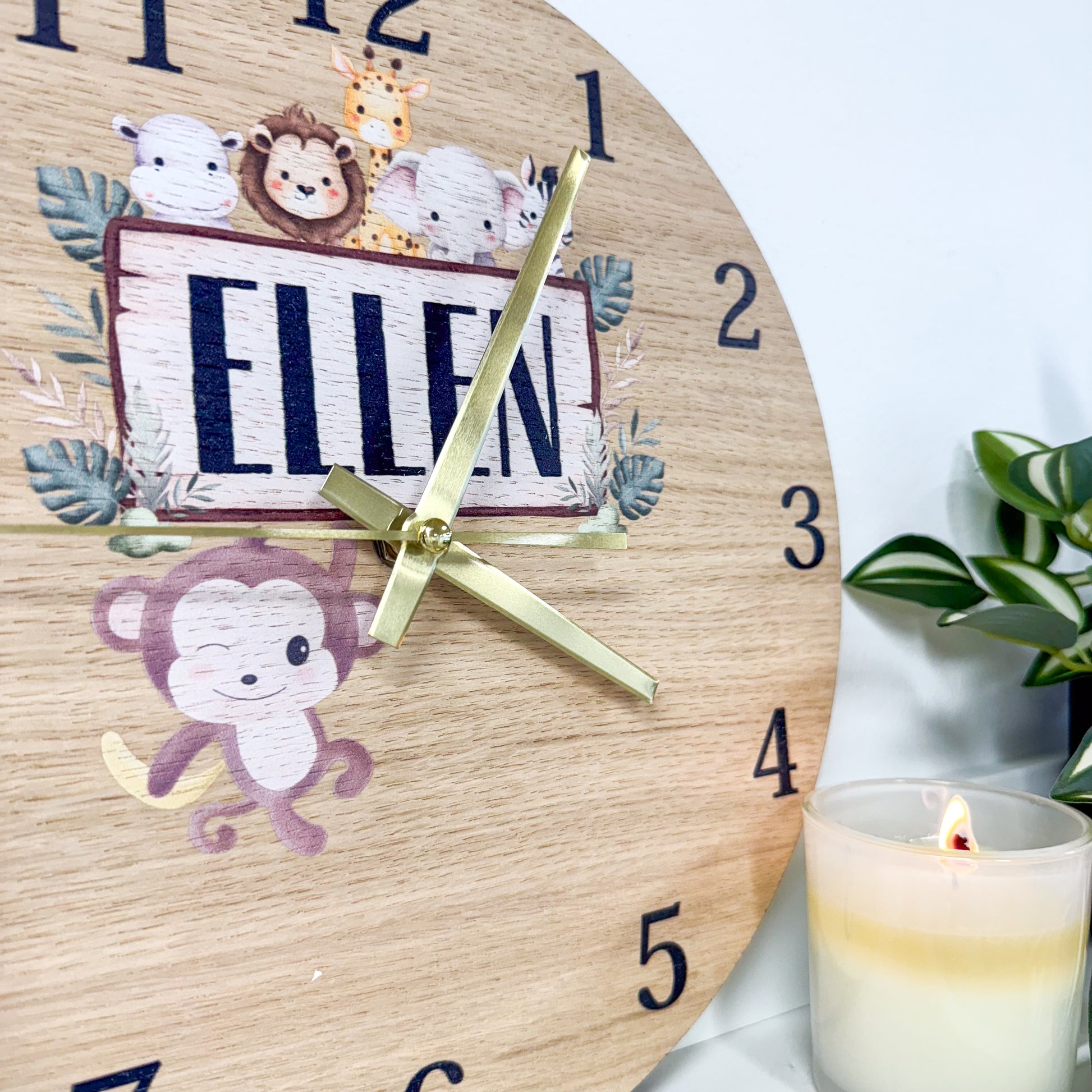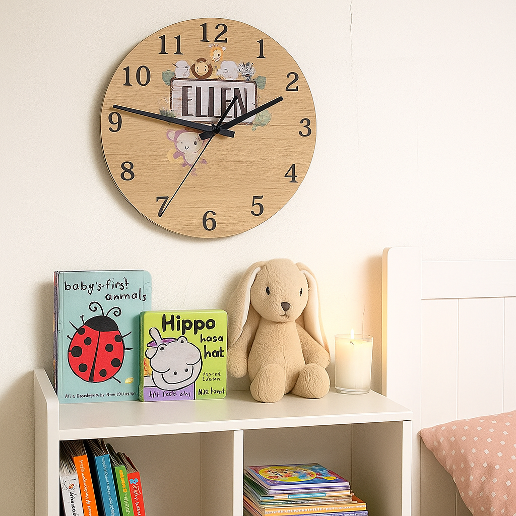 Uret er lavet af smukt egetræ og prydet med et flot print af vilde dyr og barnets navn.