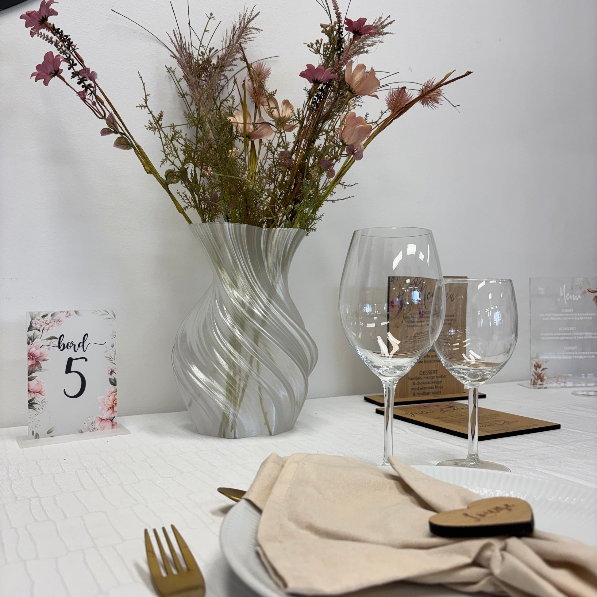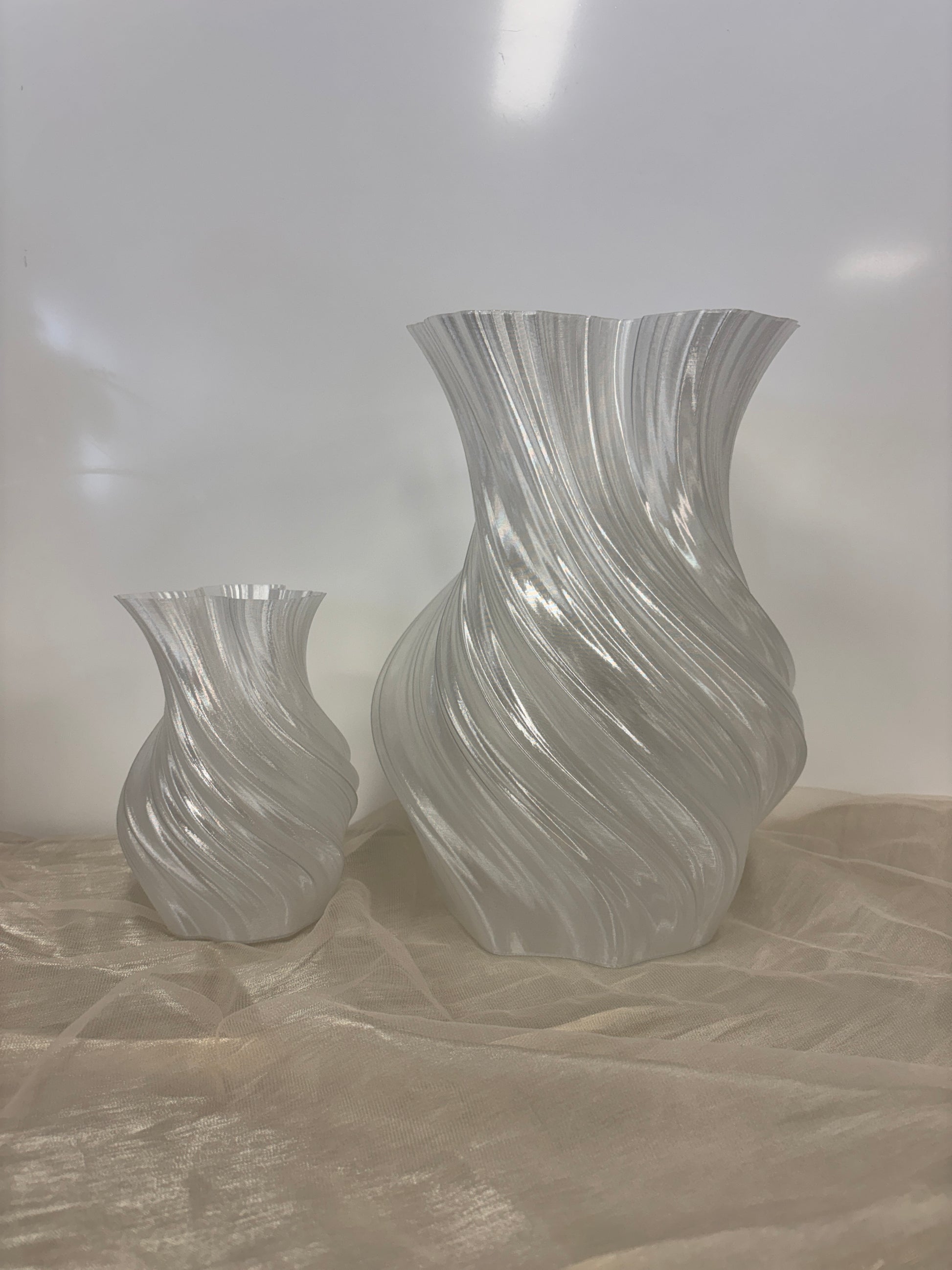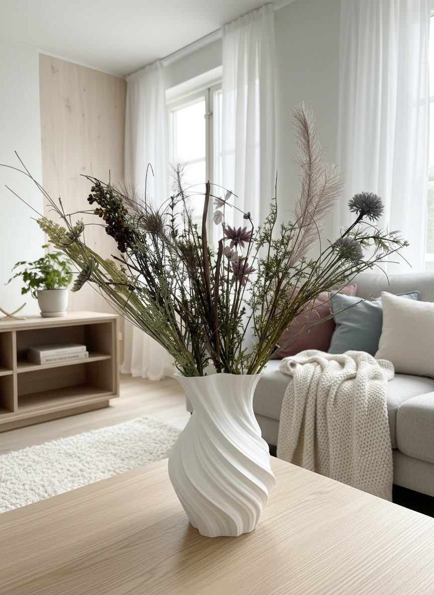 Hver vase er 3D-printet i holdbart PETG-materiale, hvilket giver en smuk, let transparent overflade. Kombinationen af teknologi og håndværk giver et unikt design med fine, bølgende detaljer, der fanger lyset fra alle vinkler.