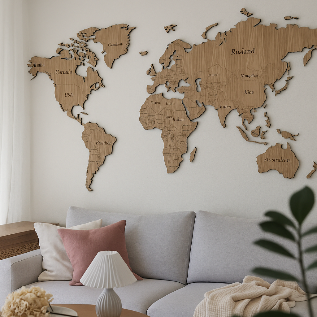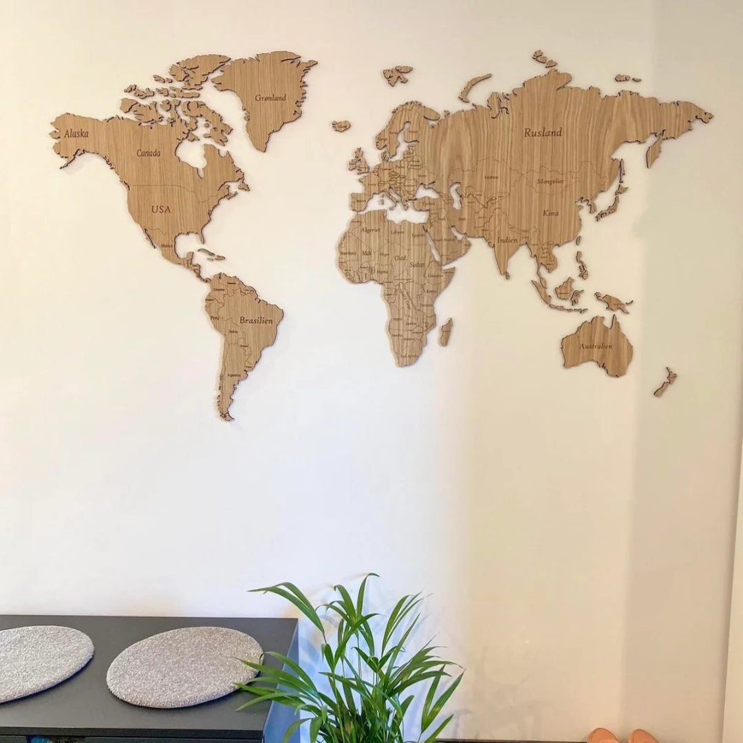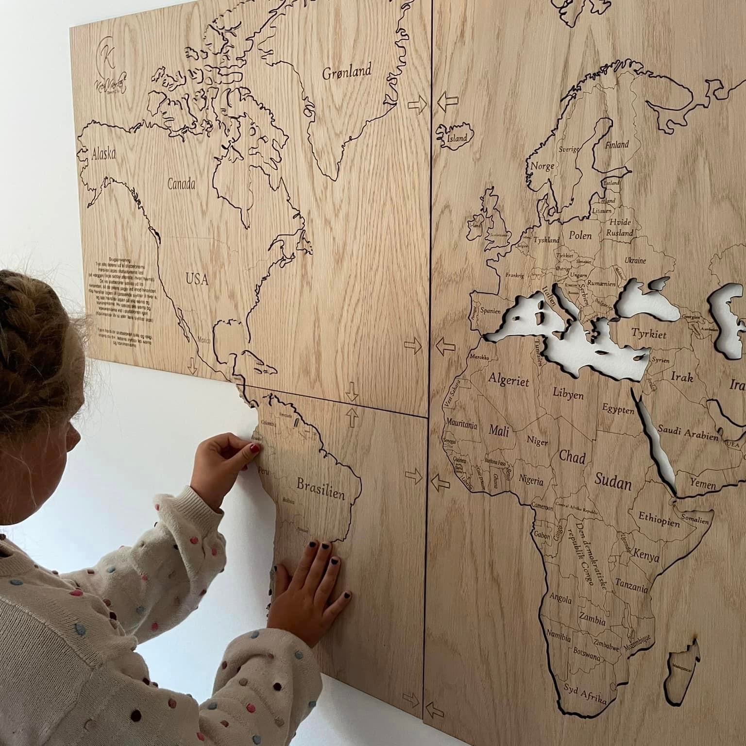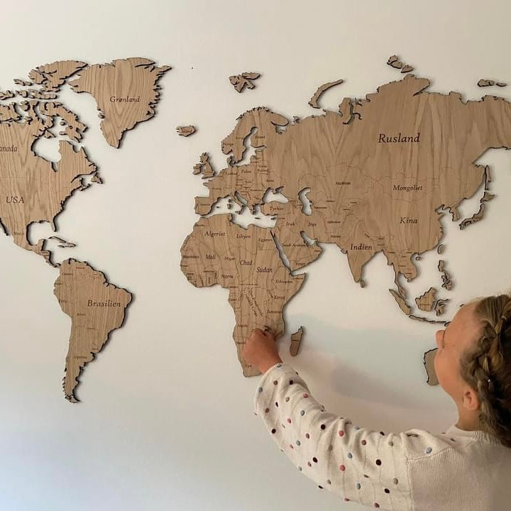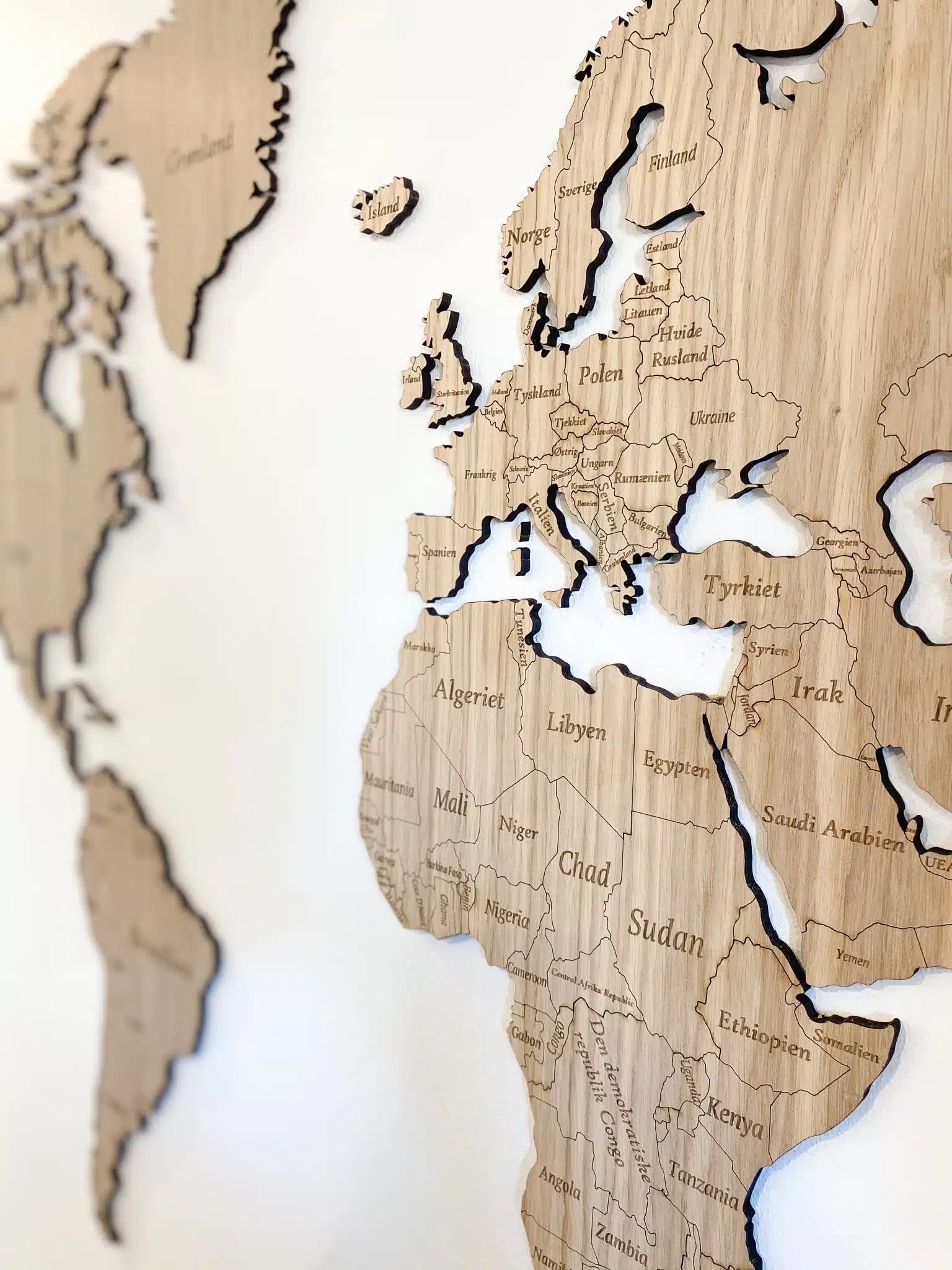 Drømmer du om at udforske verden? Nu kan du begynde rejsen direkte fra dit hjem med et smukt og detaljeret verdenskort, udskåret og graveret i egetræ.
