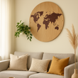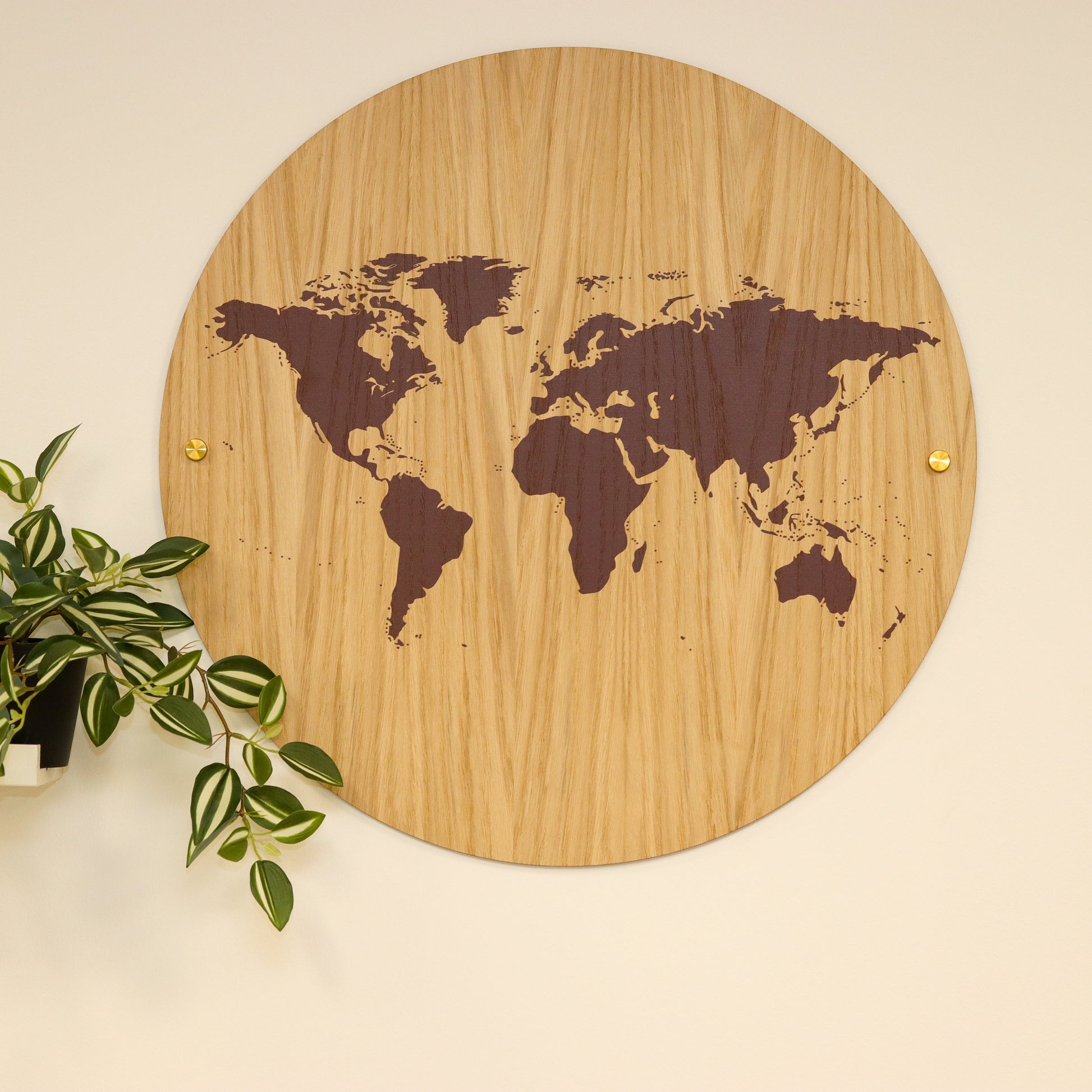 Oplev verden fra dit eget hjem med dette smukke verdenskort trykt i brun på en elegant rund egetræsplade. Kortet fås i flere størrelser: Ø40, Ø50, Ø60, Ø70 og Ø80 cm, så du kan finde præcis den størrelse, der passer perfekt til din væg.